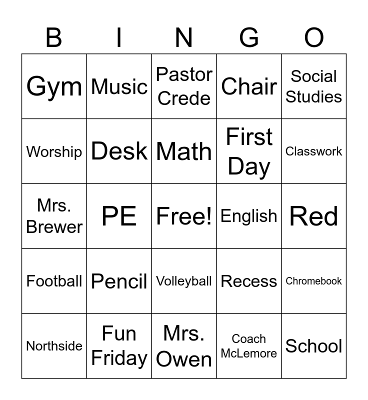 This bingo card has a free space and 47 words: Book, School, Crusader, Mrs. Owen, Pencil, Art, Music, Chapel, Worship, Band, Desk, Chair, Chromebook, Recess, Lunch, Homework, Math, English, Science, Social Studies, PE, Coach McLemore, Gym, First Day, Friends, Classwork, Northside, Dodgeball, Volleyball, Football, Soccer, Track, Cross Country, Golf, Cheer, Fun Friday, Red, White, Grey, Black, Uniform, Pastor Crede, Mrs. Brewer, Mr. Rhine, Office, Tardy and Absence.