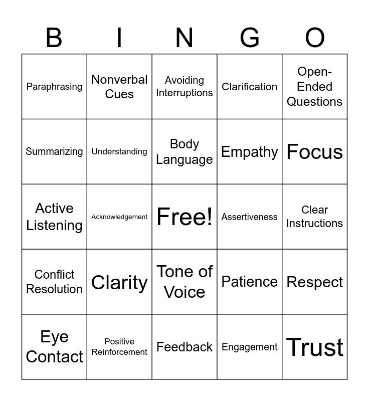 This bingo card has a free space and 25 words: Clarity, Feedback, Body Language, Eye Contact, Open-Ended Questions, Paraphrasing, Summarizing, Nonverbal Cues, Assertiveness, Tone of Voice, Empathy, Active Listening, Patience, Respect, Understanding, Emotional Intelligence, Clear Instructions, Avoiding Interruptions, Focus, Acknowledgement, Trust, Positive Reinforcement, Conflict Resolution, Clarification and Engagement.