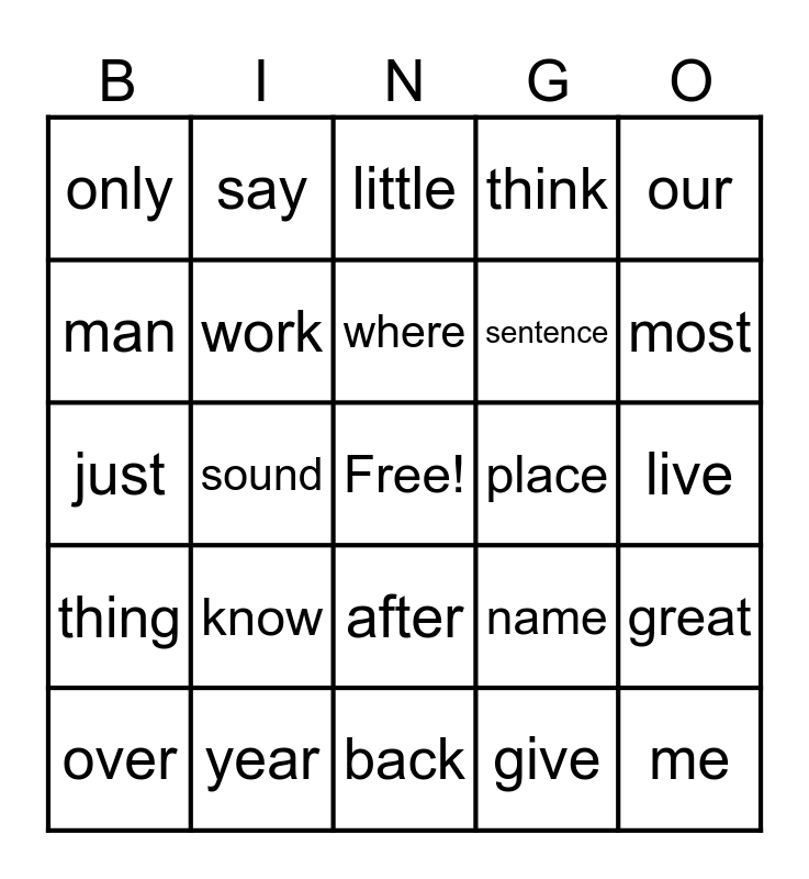 This bingo card has a free space and 29 words: over, new, sound, take, only, little, work, know, place, year, live, me, back, give, most, very, after, thing, our, just, name, good, sentence, man, think, say, great, where and help.