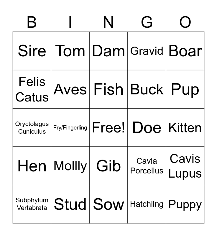 This bingo card has a free space and 27 words: Cavia Porcellus, Drake, Buck, Sow, Felis Catus, Dam, Tom, Hen, Doe, Cavis Lupus, Oryctolagus Cuniculus, Gravid, Subphylum Vertabrata, Stud, Pup, Queen, Aves, Fish, Mollly, Sire, Kitten, Hatchling, Fry/Fingerling, Puppy, Gib, Boar and Kit.