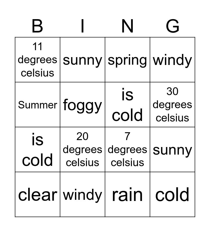 This bingo card has 24 words: four seasons, is hot, 30 degrees celsius, Autumn, Summer, 11 degrees celsius, foggy, sunny, windy, winter, is cold, 7 degrees celsius, snow, cloudy, is cold, too hot, rain, spring, 20 degrees celsius, sunny, clear, cold, windy and rain.