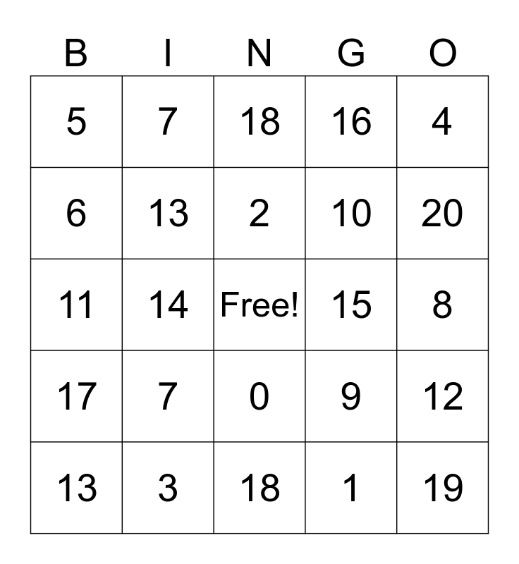 This bingo card has a free space and 26 words: 0, 1, 2, 3, 4, 5, 6, 7, 8, 9, 10, 11, 12, 13, 14, 15, 16, 17, 18, 19, 20, 18, 15, 7, 13 and 6.