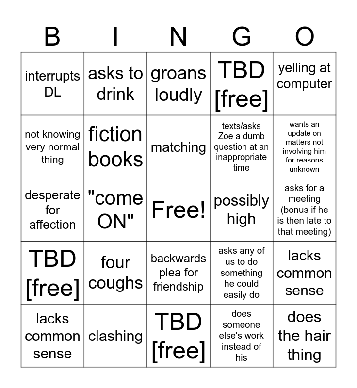This bingo card has a free space and 24 words: four coughs, clashing, matching, lacks common sense, yelling at computer, interrupts DL, not knowing very normal thing, asks to drink, possibly high, backwards plea for friendship, texts/asks Zoe a dumb question at an inappropriate time, desperate for affection, asks any of us to do something he could easily do, lacks common sense, fiction books, does someone else's work instead of his, asks for a meeting (bonus if he is then late to that meeting), groans loudly, wants an update on matters not involving him for reasons unknown, "come ON", does the hair thing, TBD [free], TBD [free] and TBD [free].