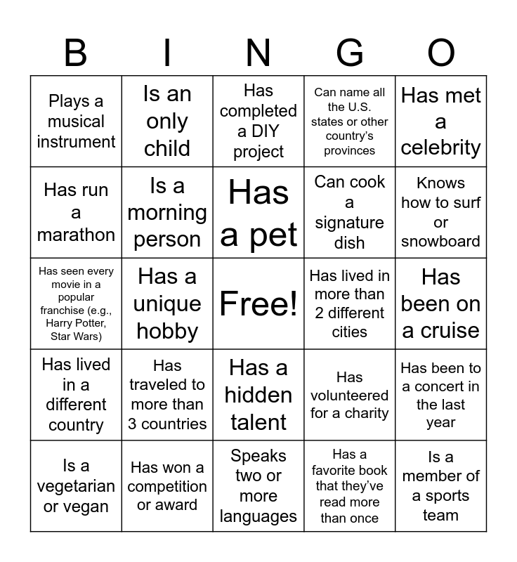 This bingo card has a free space and 25 words: Has traveled to more than 3 countries, Speaks two or more languages, Has a pet, Is a vegetarian or vegan, Has met a celebrity, Plays a musical instrument, Has run a marathon, Is an only child, Has lived in more than 2 different cities, Has a hidden talent, Can cook a signature dish, Has seen every movie in a popular franchise (e.g., Harry Potter, Star Wars), Has volunteered for a charity, Has been to a concert in the last year, Is a morning person, Has a collection (e.g., stamps, coins, memorabilia), Has been on a cruise, Has completed a DIY project, Knows how to surf or snowboard, Has a unique hobby, Is a member of a sports team, Has won a competition or award, Has lived in a different country, Can name all the U.S. states or other country’s provinces and Has a favorite book that they’ve read more than once.