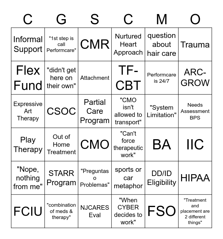 This bingo card has 36 words: sports or car metaphor, "Preguntas o Problemas", "When CYBER decides to work", Flex Fund, Play Therapy, "CMO isn't allowed to transport", "didn't get here on their own", NJCARES Eval, question about hair care, DD/ID Eligibility, ARC-GROW, Nurtured Heart Approach, HIPAA, CSOC, TF-CBT, Informal Support, "Nope, nothing from me", "System Limitation", Expressive Art Therapy, CMR, Partial Care Program, Out of Home Treatment, "Can't force therapeutic work", CMO, BA, "1st step is call Performcare", Performcare is 24/7, "combination of meds & therapy", Attachment, Trauma, "Treatment and placement are 2 different things", FCIU, IIC, Needs Assessment BPS, STARR Program and FSO.