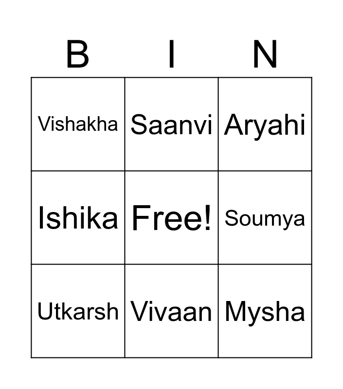 This bingo card has a free space and 21 words: Suvam, Zani, Saanvi, Sanjana, Anika, Utkarsh, Vishakha, Aryahi, Nibedita, Vivaan, Rayan, Ishika, Priyal, Attharv, Soumya, Anoushka, Reeth, Yashna, Mysha, Yohan and Diya.