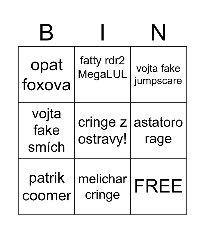 This bingo card has a free space and 8 words: astatoro rage, vojta fake jumpscare, fatty rdr2 MegaLUL, patrik coomer, opat foxova, FREE, vojta fake smích and melichar cringe.