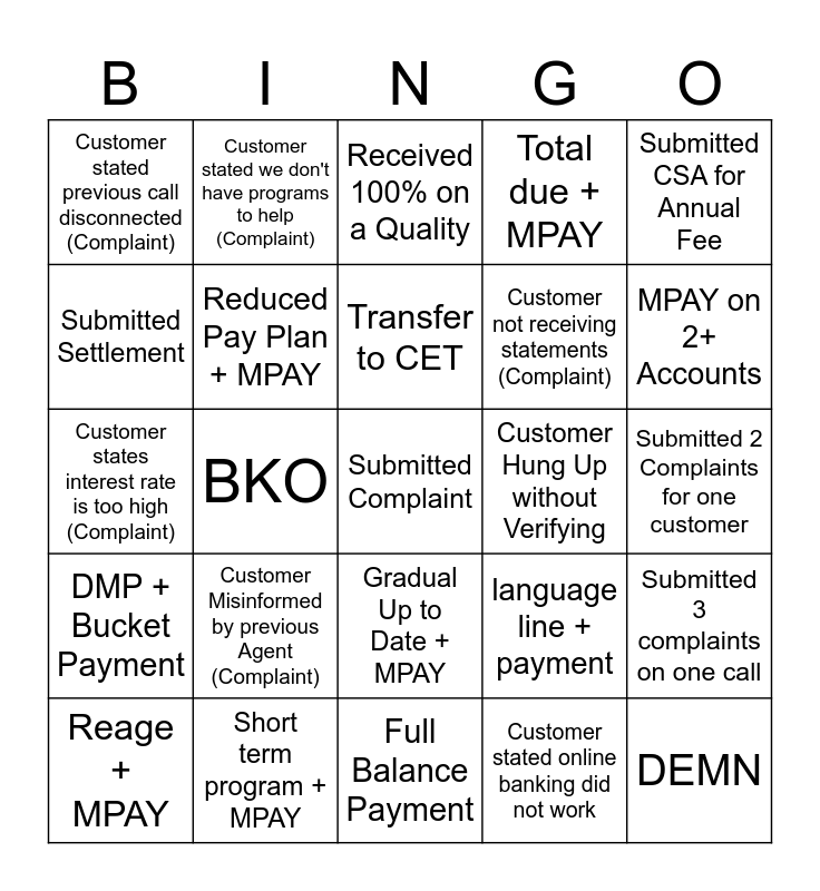 This bingo card has a free space and 24 words: Customer Misinformed by previous Agent (Complaint), Short term program + MPAY, Transfer to CET, Reage + MPAY, Submitted CSA for Annual Fee, Customer stated previous call disconnected (Complaint), Submitted Settlement, Customer stated we don't have programs to help (Complaint), Customer Hung Up without Verifying, Gradual Up to Date + MPAY, Customer not receiving statements (Complaint), Customer states interest rate is too high (Complaint), language line + payment, Submitted 3 complaints on one call, Reduced Pay Plan + MPAY, Customer stated online banking did not work, Submitted 2 Complaints for one customer, Received 100% on a Quality, MPAY on 2+ Accounts, BKO, DEMN, DMP + Bucket Payment, Total due + MPAY and Full Balance Payment.