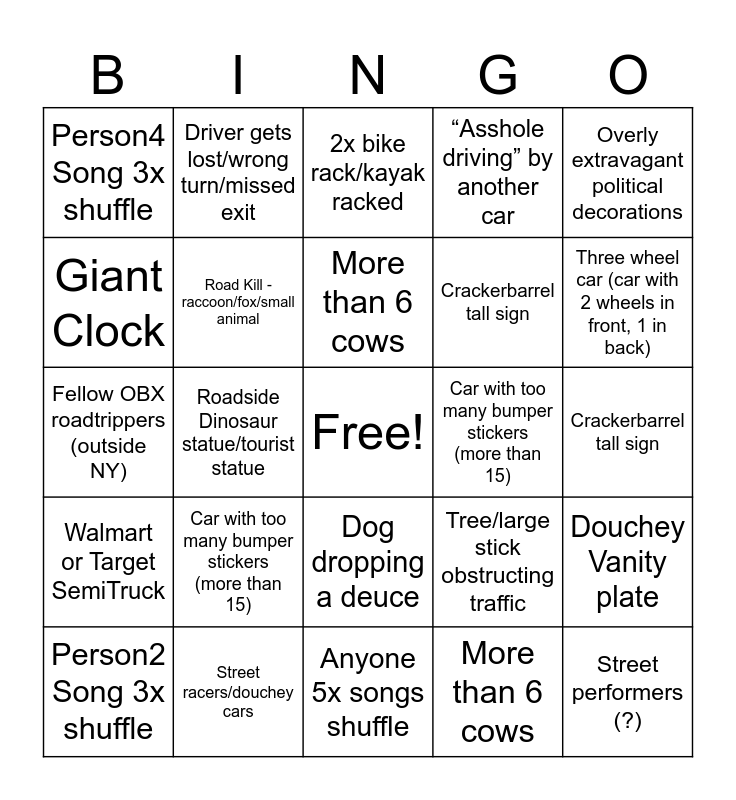 This bingo card has a free space and 57 words: Person1 Song 3x shuffle, Person2 Song 3x shuffle, Person3 Song 3x shuffle, Person4 Song 3x shuffle, Anyone 5x songs shuffle, Road Kill - deer, Road Kill - raccoon/fox/small animal, Combo PizzaHut/Taco Bell, Crackerbarrel tall sign, Giant Clock, “Asshole driving” by another car, Fellow OBX roadtrippers (outside NY), Pig Truck/horse trailer, Walmart or Target SemiTruck, Driver gets lost/wrong turn/missed exit, Dog dropping a deuce, Overly extravagant political decorations, Roadside Dinosaur statue/tourist statue, The ocean, Street performers (?), Car with too many bumper stickers (more than 15), Street racers/douchey cars, Tree/large stick obstructing traffic, 2x bike rack/kayak racked, Car carrier truck, More than 6 cows, More than 3 horses, CYBERTRUCK, Three wheel car (car with 2 wheels in front, 1 in back), Douchey Vanity plate, Stuck at 3 red lights in a row, Road Kill - deer, Road Kill - raccoon/fox/small animal, Combo PizzaHut/Taco Bell, Crackerbarrel tall sign, Giant Clock, “Asshole driving” by another car, Fellow OBX roadtrippers (outside NY), Pig Truck/horse trailer, Walmart or Target SemiTruck, Driver gets lost/wrong turn/missed exit, Dog dropping a deuce, Overly extravagant political decorations, Roadside Dinosaur statue/tourist statue, The ocean, Street performers (?), Car with too many bumper stickers (more than 15), Street racers/douchey cars, Tree/large stick obstructing traffic, 2x bike rack/kayak racked, Car carrier truck, More than 6 cows, More than 3 horses, CYBERTRUCK, Three wheel car (car with 2 wheels in front, 1 in back), Douchey Vanity plate and Stuck at 3 red lights in a row.