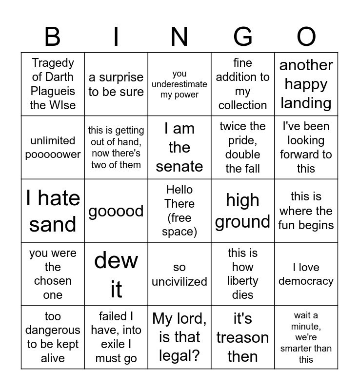 This bingo card has a free space and 24 words: dew it, failed I have, into exile I must go, I am the senate, too dangerous to be kept alive, another happy landing, Tragedy of Darth Plagueis the WIse, unlimited pooooower, a surprise to be sure, high ground, so uncivilized, twice the pride, double the fall, I hate sand, this is how liberty dies, I love democracy, this is getting out of hand, now there's two of them, it's treason then, this is where the fun begins, you underestimate my power, I've been looking forward to this, gooood, wait a minute, we're smarter than this, you were the chosen one, fine addition to my collection and My lord, is that legal?.