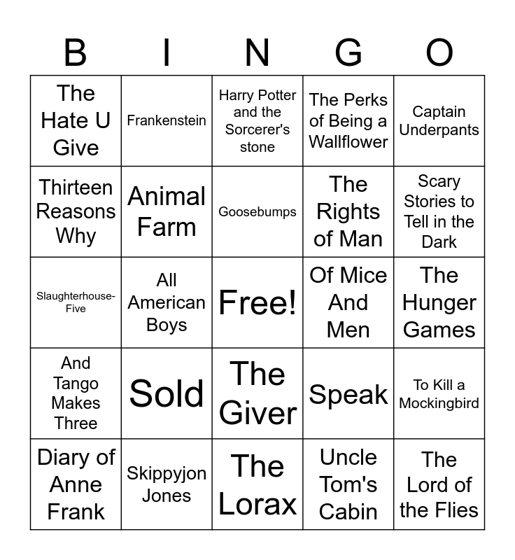 This bingo card has a free space and 33 words: 1984, Absolutely True Diary of a Part-time Indian, All American Boys, All Boys Aren’t Blue, And Tango Makes Three, Animal Farm, Captain Underpants, Diary of Anne Frank, Frankenstein, George, Goosebumps, Harry Potter and the Sorcerer's stone, Me and Earl and the Dying Girl, Mein Kampf, Of Mice And Men, Scary Stories to Tell in the Dark, Skippyjon Jones, Slaughterhouse-Five, Sold, Speak, The Giver, The Handmaid’s Tale, The Hate U Give, The Hunger Games, The Lorax, The Lord of the Flies, The Perks of Being a Wallflower, The Rights of Man, Thirteen Reasons Why, To Kill a Mockingbird, Twilight, Uncle Tom's Cabin and Where’s Waldo?.