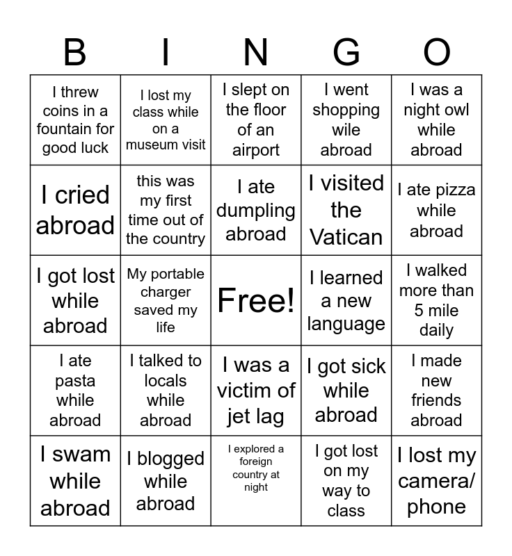 This bingo card has a free space and 24 words: I talked to locals while abroad, I blogged while abroad, I ate dumpling abroad, I swam while abroad, I was a night owl while abroad, I threw coins in a fountain for good luck, I cried abroad, I lost my class while on a museum visit, I learned a new language, I was a victim of jet lag, I visited the Vatican, I got lost while abroad, I got sick while abroad, I made new friends abroad, this was my first time out of the country, I got lost on my way to class, I walked more than 5 mile daily, I slept on the floor of an airport, I ate pizza while abroad, My portable charger saved my life, I lost my camera/ phone, I ate pasta while abroad, I went shopping wile abroad and I explored a foreign country at night.