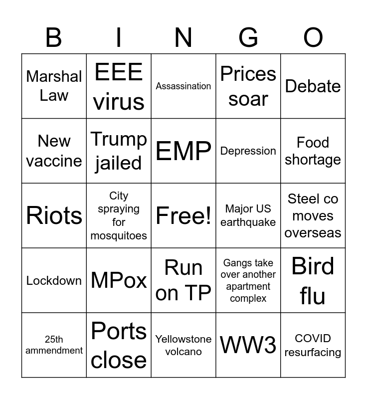 This bingo card has a free space and 24 words: MPox, Ports close, EMP, 25th ammendment, Debate, Marshal Law, New vaccine, EEE virus, Major US earthquake, Run on TP, Depression, Riots, Gangs take over another apartment complex, Bird flu, Trump jailed, WW3, Steel co moves overseas, Assassination, Food shortage, City spraying for mosquitoes, COVID resurfacing, Lockdown, Prices soar and Yellowstone volcano.