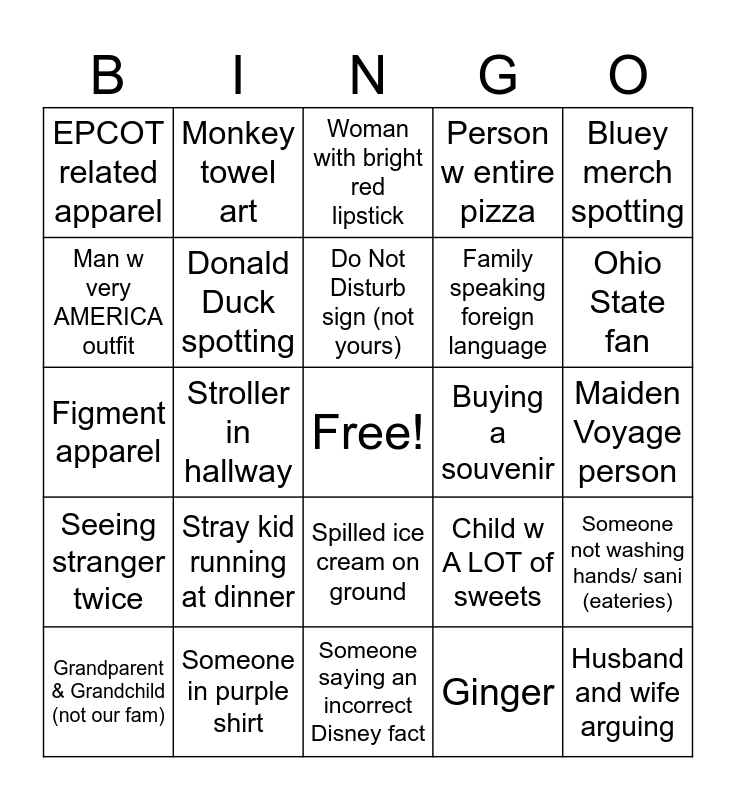 This bingo card has a free space and 49 words: Karen, Husband and wife arguing, Family Vacation Shirts, Someone saying an incorrect Disney fact, Stray kid running at dinner, Kid not wanting to go Kids Club, Monkey towel art, Sunburnt lady, Man w very AMERICA outfit, Adult or child crying, Donald Duck spotting, Person w entire pizza, Someone not washing hands/ sani (eateries), Child w A LOT of sweets, Life is Good shirt, Couple that are def doing it tonight, Do Not Disturb sign (not yours), Buying a souvenir, Pixie Dusted, Bluey merch spotting, Stroller in hallway, Ginger, EPCOT related apparel, Family speaking foreign language, Other Cruise Line apparel, Ohio State fan, Grandparent & Grandchild (not our fam), Kid going to waterslide again, Spilled ice cream on ground, Seeing stranger twice, Winning trivia, Look at jewelry (speak to attendant), Buy drink from Cove Cafe, Watch entire movie in theatre, Someone in purple shirt, Haunted Mansion merch, "Expensive vaca" shirt wearing man, Shirt that says "sissy", Maiden Voyage person, Manchester United fan, Tiana costume, Cast member named "Nigel", Tell someone to have a "Zip a Dee Doo Dah" Day, Ask if you can meet Shrek on ship, Figment apparel, Woman with bright red lipstick, Blue toe nail polish, Lip filler and Country Club Mom (IYKYK).