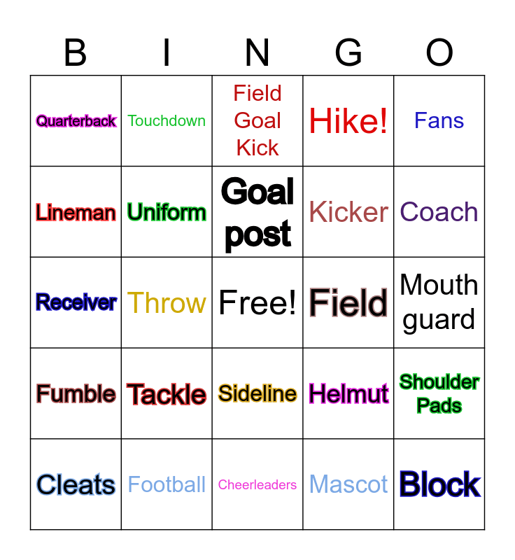 This bingo card has a free space and 24 words: Tackle, Football, Goal post, Cleats, Fans, Quarterback, Lineman, Touchdown, Field, Sideline, Kicker, Receiver, Helmut, Shoulder Pads, Uniform, Mascot, Mouth guard, Field Goal Kick, Coach, Throw, Block, Fumble, Hike! and Cheerleaders.