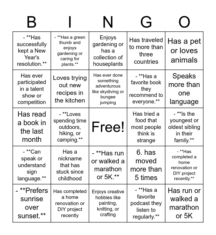 This bingo card has a free space and 144 words: 1. read a book in the last month, 2. traveled out of the country in the last year, 3. has their birthday in september, 4. went camping, 5. taken dance lessons, 6. has moved more than 5 times, - **Has traveled to more than three countries.**, - **Has ever changed careers or started a new job later in life.**, - **Loves to read and can recommend a great book.**, - **Has a special family recipe passed down through generations.**, - **Is an early bird who loves mornings.**, - **Has a favorite movie they’ve watched more than five times.**, - **Speaks more than one language.**, - **Has a unique or interesting family tradition.**, - **Has tried a food that most people think is strange.**, - **Loves to shop at thrift stores or for vintage items.**, - **Enjoys creative hobbies like painting, knitting, or crafting.**, - **Has a favorite podcast or radio show they listen to regularly.**, - **Can remember their first job or a funny work story.**, - **Has participated in a fitness challenge or race.**, - **Loves to host dinner parties or gatherings.**, - **Has completed a home renovation or DIY project recently.**, - **Enjoys cooking or baking from scratch.**, - **Has a favorite holiday or vacation destination.**, - **Has ever lived in a different state or country.**, - **Loves spending time outdoors, hiking, or camping.**, - **Has a green thumb and enjoys gardening or caring for plants.**, - **Has a talent for singing, dancing, or playing an instrument.**, - **Has ever participated in a talent show or competition.**, - **Loves to travel and explore new places.**, - **Enjoys playing board games or card games with family and friends.**, - **Has met someone famous or had an interesting encounter with a celebrity.**, - **Has ever done something adventurous like skydiving or bungee jumping.**, - **Is the youngest or oldest sibling in their family.**, - **Loves organizing and keeping things tidy.**, - **Loves to decorate their home for the holidays or special occasions.**, - **Has traveled to more than three countries.**, - **Loves trying out new recipes in the kitchen.**, - **Has a favorite book they recommend to everyone.**, - **Enjoys gardening or has a collection of houseplants.**, - **Speaks more than one language.**, - **Has a pet or loves animals.**, - **Has run or walked a marathon or 5K.**, - **Loves to dance whenever music plays.**, - **Has recently learned a new skill or hobby.**, - **Prefers tea over coffee.**, - **Plays a musical instrument or loves to sing.**, - **Has lived in more than three different cities.**, - **Enjoys outdoor activities like hiking or camping.**, - **Has a hidden talent most people don't know about.**, - **Collects something unique or interesting.**, - **Has met someone famous or a celebrity.**, - **Prefers sunrise over sunset.**, - **Has tried an adventurous activity like skydiving or scuba diving.**, - **Is an only child.**, - **Has attended a concert in the past year.**, - **Enjoys painting, drawing, or other forms of art.**, - **Has read more than five books this year.**, - **Prefers winter over summer.**, - **Has a favorite sports team they cheer for.**, - **Enjoys DIY projects around the house.**, - **Has a favorite podcast they listen to regularly.**, - **Loves to go thrift shopping or antiquing.**, - **Enjoys baking desserts for friends and family.**, - **Has taken a spontaneous road trip.**, - **Can speak or understand sign language.**, - **Prefers movies over TV shows.**, - **Has a nickname that has stuck since childhood.**, - **Has appeared on TV or in a newspaper.**, - **Loves trying cuisines from different cultures.**, 1. is the youngest in her family, - **Has successfully kept a New Year's resolution.**, Has read a book in the last month, Has traveled out of the country in the last year, Has their birthday in September, Went camping over the summer, Has taken dance lessons, Has moved more than 5 times, Has traveled to more than three countries, Has ever changed careers or started a new job later in life, Loves to read and can recommend a great book, Has a special family recipe passed down through generations, Is an early bird who loves mornings, Has a favourite movie they’ve watched more than five times, Speaks more than one language, Has a unique or interesting family tradition, Has tried a food that most people think is strange, Loves to shop at thrift stores or for vintage items, Enjoys creative hobbies like painting, knitting, or crafting, Has a favorite podcast or radio show they listen to regularly, Can remember their first job or a funny work story, Has participated in a fitness challenge or race, Loves to host dinner parties or gatherings, Has completed a home renovation or DIY project recently, Enjoys cooking or baking from scratch, Has a favorite holiday or vacation destination, Has ever lived in a different state or country, Loves spending time outdoors, hiking, or camping, Has a green thumb and enjoys gardening or caring for plants, Has a talent for singing, dancing, or playing an instrument, Has ever participated in a talent show or competition, Loves to travel and explore new places, Enjoys playing board games or card games with family and friends, Has met someone famous or had an interesting encounter with a celebrity, Has ever done something adventurous like skydiving or bungee jumping, Is the youngest or oldest sibling in their family, Loves organizing and keeping things tidy, Loves to decorate their home for the holidays or special occasions, Has traveled to more than three countries, Loves trying out new recipes in the kitchen, Has a favorite book they recommend to everyone, Enjoys gardening or has a collection of houseplants, Speaks more than one language, Has a pet or loves animals, Has run or walked a marathon or 5K, Loves to dance whenever music plays, Has recently learned a new skill or hobby, Prefers tea over coffee, Plays a musical instrument or loves to sing, Has lived in more 
