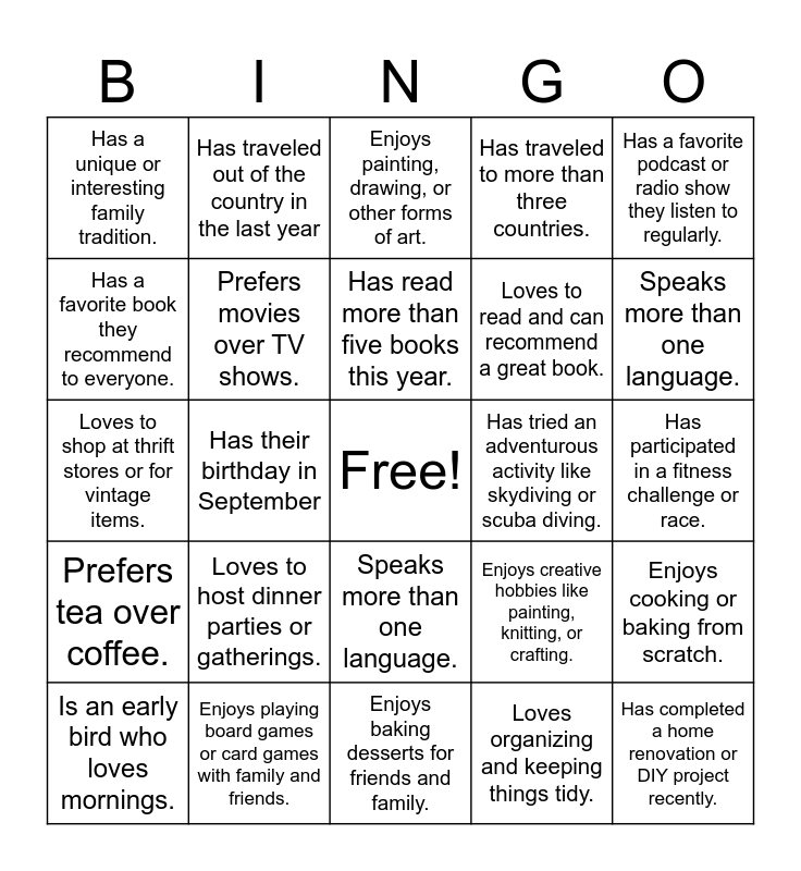 This bingo card has a free space and 72 words: Has read a book in the last month, Has traveled out of the country in the last year, Has their birthday in September, Went camping, Has taken dance lessons, Has moved more than 5 times, Has traveled to more than three countries., Has ever changed careers or started a new job later in life., Loves to read and can recommend a great book., Has a special family recipe passed down through generations., Is an early bird who loves mornings., Has a favorite movie they’ve watched more than five times., Speaks more than one language., Has a unique or interesting family tradition., Has tried a food that most people think is strange., Loves to shop at thrift stores or for vintage items., Enjoys creative hobbies like painting, knitting, or crafting., Has a favorite podcast or radio show they listen to regularly., Can remember their first job or a funny work story., Has participated in a fitness challenge or race., Loves to host dinner parties or gatherings., Has completed a home renovation or DIY project recently., Enjoys cooking or baking from scratch., Has a favorite holiday or vacation destination., Has ever lived in a different state or country., Loves spending time outdoors, hiking, or camping., Has a green thumb and enjoys gardening or caring for plants., Has a talent for singing, dancing, or playing an instrument., Has ever participated in a talent show or competition., Loves to travel and explore new places., Enjoys playing board games or card games with family and friends., Has met someone famous or had an interesting encounter with a celebrity., Has ever done something adventurous like skydiving or bungee jumping., Is the youngest or oldest sibling in their family., Loves organizing and keeping things tidy., Loves to decorate their home for the holidays or special occasions., Has traveled to more than three countries., Loves trying out new recipes in the kitchen., Has a favorite book they recommend to everyone., Enjoys gardening or has a collection of houseplants., Speaks more than one language., Has a pet or loves animals., Has run or walked a marathon or 5K., Loves to dance whenever music plays., Has recently learned a new skill or hobby., Prefers tea over coffee., Plays a musical instrument or loves to sing., Has lived in more than three different cities., Enjoys outdoor activities like hiking or camping., Has a hidden talent most people don't know about., Collects something unique or interesting., Has met someone famous or a celebrity., Prefers sunrise over sunset., Has tried an adventurous activity like skydiving or scuba diving., Is an only child., Has attended a concert in the past year., Enjoys painting, drawing, or other forms of art., Has read more than five books this year., Prefers winter over summer., Has a favorite sports team they cheer for., Enjoys DIY projects around the house., Has a favorite podcast they listen to regularly., Loves to go thrift shopping or antiquing., Enjoys baking desserts for friends and family., Has taken a spontaneous road trip., Can speak or understand sign language., Prefers movies over TV shows., Has a nickname that has stuck since childhood., Has appeared on TV or in a newspaper., Loves trying cuisines from different cultures., Is the youngest in her family and Has successfully kept a New Year's resolution..