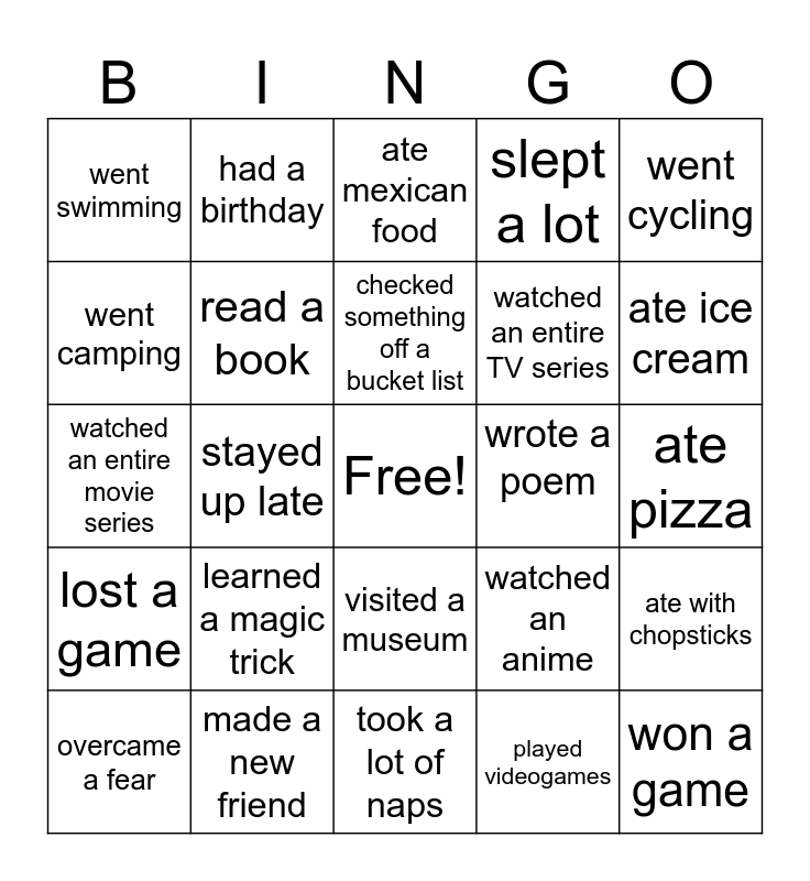 This bingo card has a free space and 24 words: learned a magic trick, made a new friend, checked something off a bucket list, overcame a fear, went cycling, went swimming, went camping, had a birthday, wrote a poem, visited a museum, watched an entire TV series, watched an entire movie series, watched an anime, ate with chopsticks, read a book, played videogames, ate pizza, ate mexican food, ate ice cream, stayed up late, won a game, lost a game, slept a lot and took a lot of naps.