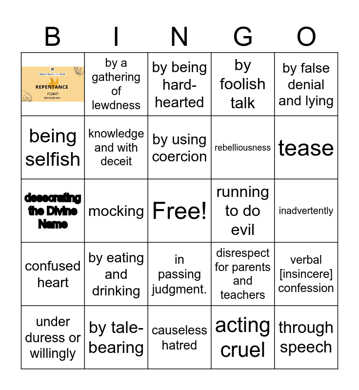 This bingo card has 1 images, a free space and 28 words: under duress or willingly, openly or secretly, mocking, by frivolity, by being hard-hearted, knowledge and with deceit, by eating and drinking, running to do evil, by tale-bearing, inadvertently, through speech, causeless hatred, acting cruel, tease, improper thoughts, in passing judgment., confused heart, by false denial and lying, desecrating the Divine Name, disrespect for parents and teachers, haughty demeanor, rebelliousness, being selfish, by foolish talk, by a gathering of lewdness, verbal [insincere] confession, by using coercion and cheating.