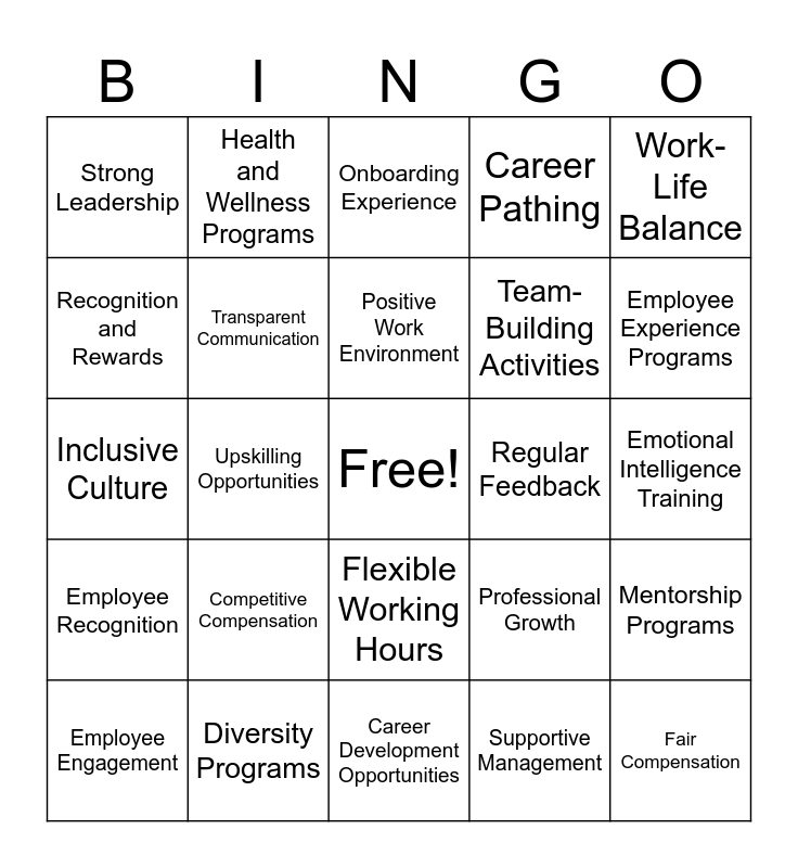 This bingo card has a free space and 25 words: Competitive Compensation, Career Development Opportunities, Positive Work Environment, Employee Engagement, Work-Life Balance, Strong Leadership, Recognition and Rewards, Health and Wellness Programs, Regular Feedback, Flexible Working Hours, Team-Building Activities, Inclusive Culture, Professional Growth, Mentorship Programs, Transparent Communication, Employee Surveys, Emotional Intelligence Training, Onboarding Experience, Employee Experience Programs, Upskilling Opportunities, Fair Compensation, Diversity Programs, Employee Recognition, Career Pathing and Supportive Management.