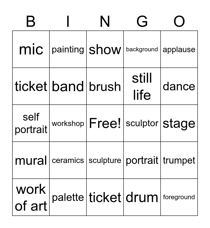 This bingo card has a free space and 24 words: ceramics, palette, brush, work of art, applause, mic, ticket, painting, sculptor, sculpture, still life, self portrait, portrait, trumpet, band, drum, stage, show, dance, workshop, foreground, mural, background and ticket.