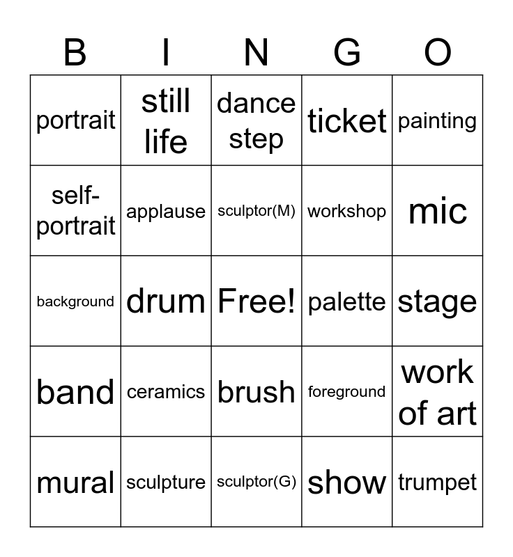 This bingo card has a free space and 24 words: ceramics, sculpture, sculptor(M), mural, painting, portrait, self-portrait, still life, palette, brush, workshop, background, foreground, work of art, applause, show, stage, dance step, mic, drum, trumpet, band, ticket and sculptor(G).