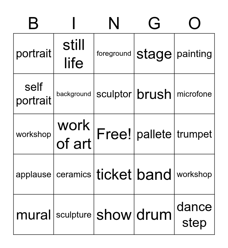 This bingo card has a free space and 24 words: ceramics, sculpture, sculptor, mural, painting, portrait, self portrait, still life, pallete, ticket, brush, workshop, band, workshop, background, drum, trumpet, foreground, microfone, work of art, dance step, applause, stage and show.