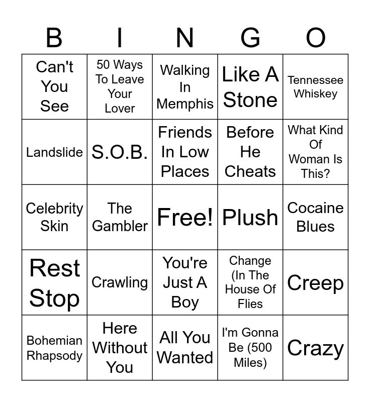 This bingo card has a free space and 71 words: Love Her Madly, 50 Ways To Leave Your Lover, Always Remember Us….., Africa, All You Wanted, Why, Like A Stone, Baby Got Back, Before He Cheats, Turn the Lights Back On, Bohemian Rhapsody, Brandy (You're a Fine Girl), What Kind Of Woman Is This?, Can't You See, Can't Stop, Celebrity Skin, Change (In The House Of Flies, Tennessee Whiskey, You Should Probably Leave, Cocaine Blues, Crawling, Crazy, Creep, Crocodile Rock, Dreams, Drink In My Hand, Numb Little Bug, Every Breath You Take, Fortunate Son, Gunpowder & Lead, Here Without You, Hero, Hey Jealousy, If You Could Only See, I'm Gonna Be (500 Miles), It's Five O'Clock Somewhere, Joey, Tomorrow, Landslide, Love Is A Battlefield, You're Just A Boy, Master Of Puppets, Rest Stop, Me and Bobby McGee, Mope, Whiskey Glasses, My Way, S.O.B., No One Knows, Oh! Darling, Picture, Time, Plush, Redneck Woman, Ring Of Fire, I'm A Survivor, Friends In Low Places, Seek & Destroy, Cry To Me, Superstar, Sweet Caroline (Good Times Ne, That's What I Like About You, The Gambler, Drift Away, Valerie, Walk, Walking In Memphis, White Rabbit, You Are So Beautiful, You Never Even Called Me By M and You Oughta Know.