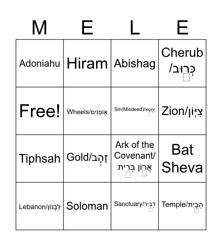 This bingo card has 16 words: Soloman, Bat Sheva, Abishag, Adoniahu, Tiphsah, Hiram, Ark of the Covenant/ אֲר֖וֹן בְּרִ֥ית, Sanctuary/דְבִ֧יר, Free!, Wheels/אֽוֹפַנִּ֗ים, Lebanon/לְּבָנ֗וֹן, Cherub /כְּר֣וּב, Gold/זָהָֽב, Zion/צִיּֽוֹן, Sin(Misdeed)/יֶחֱטָ֥א and Temple/הַבַּ֚יִת.
