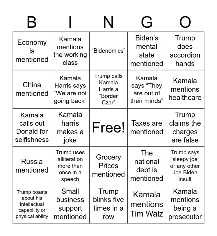 This bingo card has a free space and 37 words: Trump says “Comrade Kamala”, Kamala Harris Laughs, Kamala Harris says “Joy”, Kamala Harris says “We are not going back”, Trump says “sleepy joe” or any other Joe Biden insult, Trump uses alliteration more than once in a speech, Trump calls Kamala Harris a “Border Czar”, Trump calls Kamala a “San Francisco Liberal”, Trump does accordion hands, Trump points at the audience, Kamala harris makes a joke, Biden’s mental state mentioned, Kamala mentions being a prosecutor, Trump claims the charges are false, China mentioned, Russia mentioned, Gas prices mentioned, “Bidenomics”, Grocery Prices mentioned, Taxes are mentioned, Economy is mentioned, Kamala mentions healthcare, Trump boasts about his intellectual capability or physical ability, Trump blinks five times in a row, Trump mentions his Twitter or a tweet, Kamala mentions Tim Walz, Kamala mentions the working class, Kamala mentions being an attorney general, Kamala calls Donald out for fraud, Kamala says “Consider it”, Creating jobs is mentioned, Small business support mentioned, Kamala calls out Donald for selfishness, Trump tax is mentioned, The national debt is mentioned, Kamala says “They are out of their minds” and Trump closes his eyes for 5-10 seconds (sleepy time).