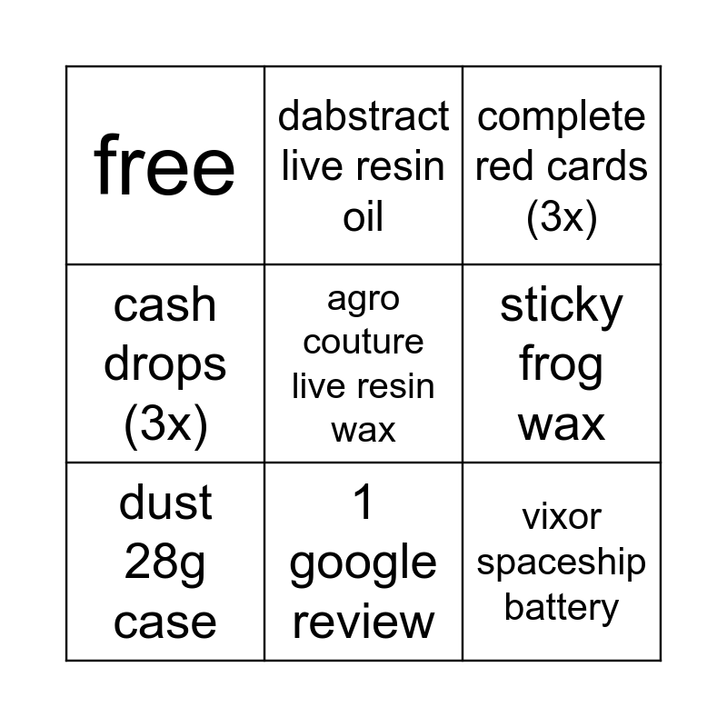 This bingo card has 9 words: dust 28g case, complete red cards (3x), dabstract live resin oil, cash drops (3x), free, sticky frog wax, agro couture live resin wax, vixor spaceship battery and 1 google review.