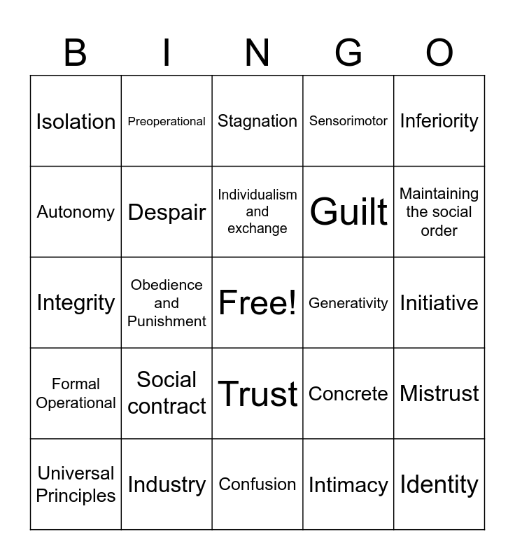 This bingo card has a free space and 26 words: Trust, Intimacy, Individualism and exchange, Industry, Inferiority, Isolation, Autonomy, Preoperational, Initiative, Concrete, Guilt, Integrity, Mistrust, Universal Principles, Obedience and Punishment, Shame and doubt, Sensorimotor, Formal Operational, Stagnation, Identity, Maintaining the social order, Confusion, Generativity, Social contract, Despair and Good interpersonal relationships.