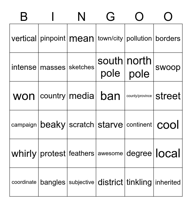 This bingo card has 45 words: win, won, bully, scratch, awesome, cool, mean, harm, pollution, starve, town/city, country, street, county/province, district, continent, local, north pole, the equator, south pole, pinpoint, coordinate, degree, vertical, admire, media, protest, activist, campaign, ban, banned, beaky, subjective, tinkling, bangles, swoop, feathers, inherited, whirly, masses, borders, sketches, puffin, intense and rotate.