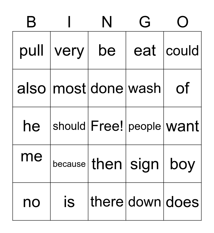 This bingo card has a free space and 49 words: do, does, here, there, because, little, very, were, also, off, most, eat, boy, sign, girl, use, done, people, yesterday, could, should, down, pull, wash, we, of, no, will, then, me, was, saw, and, with, is, saw, just, no, want, his, and, this, that, went, he, be, she, own and nothing.
