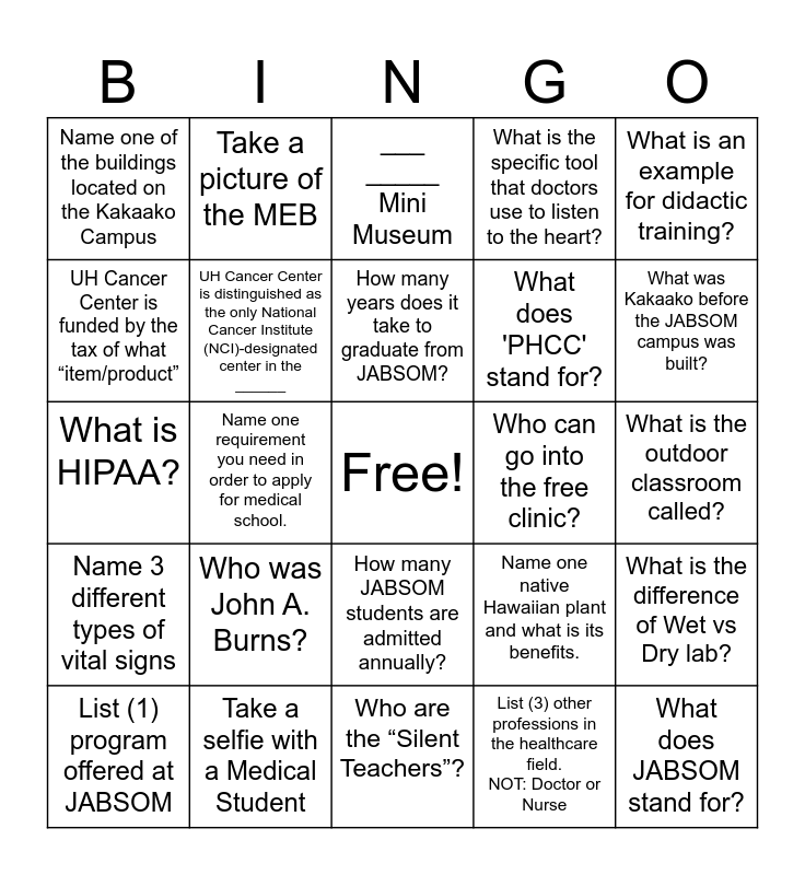This bingo card has a free space and 24 words: Who was John A. Burns?, Take a selfie with a Medical Student, How many years does it take to graduate from JABSOM?, List (1) program offered at JABSOM, What is an example for didactic training?, Name one of the buildings located on the Kakaako Campus, UH Cancer Center is funded by the tax of what “item/product”, Take a picture of the MEB, Who can go into the free clinic?, How many JABSOM students are admitted annually?, What does 'PHCC' stand for?, What is HIPAA?, Name one native Hawaiian plant and what is its benefits., What is the difference of Wet vs Dry lab?, UH Cancer Center is distinguished as the only National Cancer Institute (NCI)-designated center in the ______, List (3) other professions in the healthcare field. NOT: Doctor or Nurse, What is the outdoor classroom called?, ___ _____ Mini Museum, What was Kakaako before the JABSOM campus was built?, Name one requirement you need in order to apply for medical school., What does JABSOM stand for?, Name 3 different types of vital signs, What is the specific tool that doctors use to listen to the heart? and Who are the “Silent Teachers”?.
