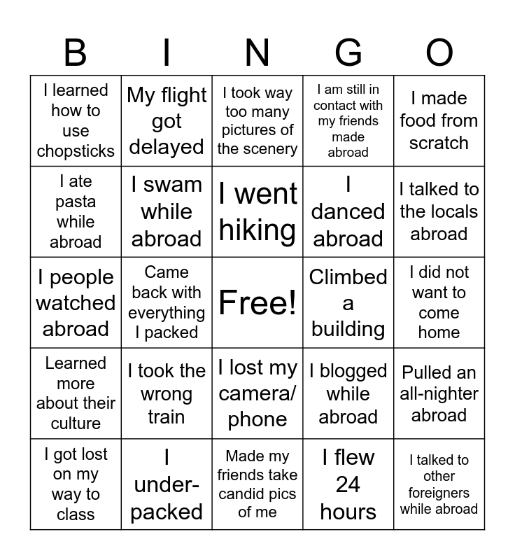This bingo card has a free space and 24 words: I took the wrong train, I under-packed, I went hiking, I got lost on my way to class, I made food from scratch, I learned how to use chopsticks, I ate pasta while abroad, My flight got delayed, Climbed a building, I lost my camera/ phone, I danced abroad, I people watched abroad, I blogged while abroad, Pulled an all-nighter abroad, I swam while abroad, I flew 24 hours, I did not want to come home, I took way too many pictures of the scenery, I talked to the locals abroad, Came back with everything I packed, I talked to other foreigners while abroad, Learned more about their culture, I am still in contact with my friends made abroad and Made my friends take candid pics of me.