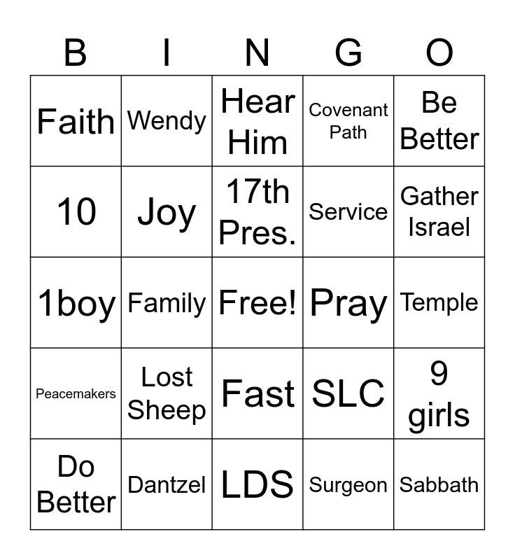 This bingo card has a free space and 24 words: Lost Sheep, Dantzel, 17th Pres., Do Better, Be Better, Faith, 10, Wendy, Pray, Fast, Service, 1boy, SLC, 9 girls, Joy, Surgeon, Temple, Hear Him, Gather Israel, Family, Sabbath, Peacemakers, Covenant Path and LDS.