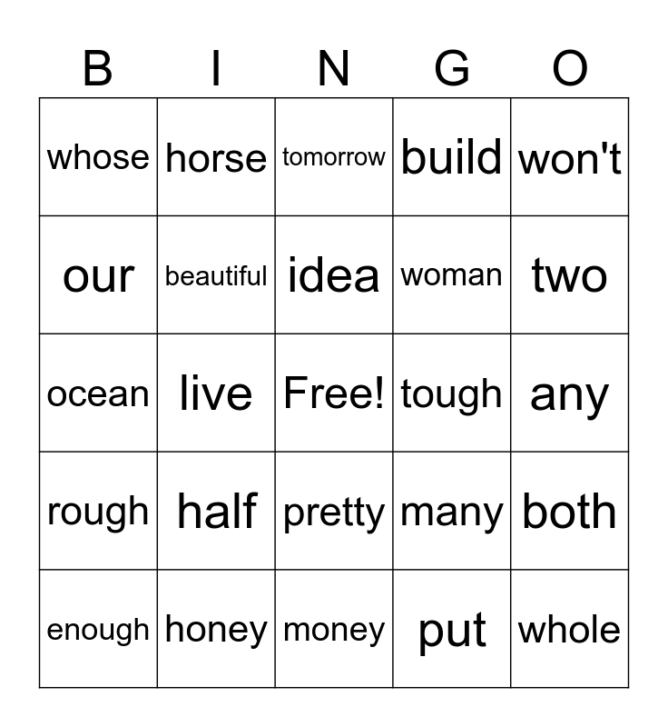 This bingo card has a free space and 28 words: both, before, woman, put, our, tomorrow, horse, rough, tough, enough, ocean, build, honey, money, two, science, half, beautiful, idea, pretty, whose, laugh, whole, live, any, many, won't and sure.