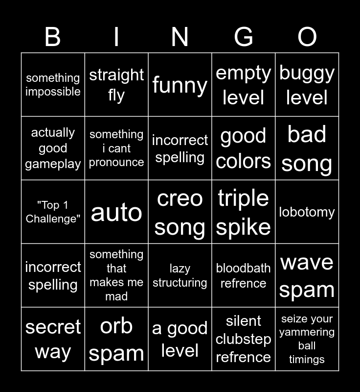 This bingo card has 25 words: something that makes me mad, a good level, incorrect spelling, secret way, buggy level, something impossible, actually good gameplay, straight fly, triple spike, lazy structuring, good colors, "Top 1 Challenge", bloodbath refrence, wave spam, something i cant pronounce, seize your yammering ball timings, lobotomy, funny, bad song, auto, creo song, orb spam, incorrect spelling, empty level and silent clubstep refrence.