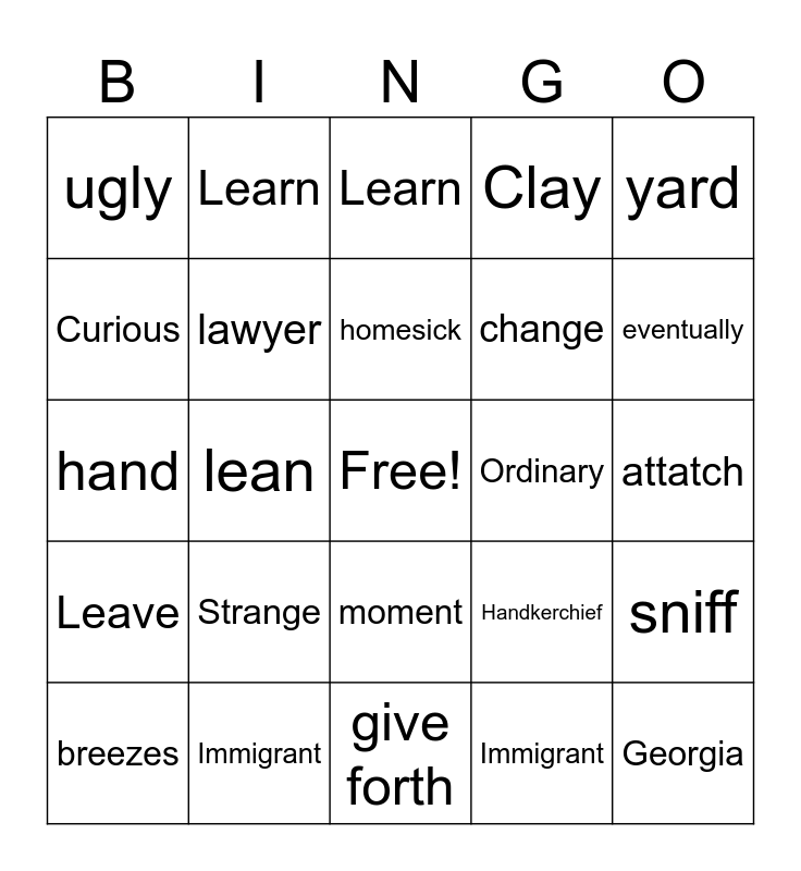 This bingo card has a free space and 24 words: Strange, Immigrant, homesick, breezes, yard, ugly, Curious, Learn, Ordinary, moment, change, hand, Handkerchief, sniff, lawyer, Immigrant, attatch, Learn, eventually, lean, Georgia, Leave, Clay and give forth.