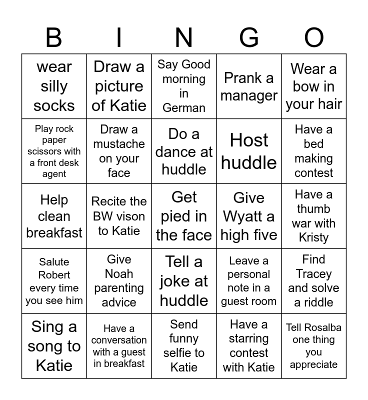This bingo card has a free space and 24 words: Give Noah parenting advice, Have a conversation with a guest in breakfast, Do a dance at huddle, Sing a song to Katie, Wear a bow in your hair, wear silly socks, Play rock paper scissors with a front desk agent, Draw a picture of Katie, Give Wyatt a high five, Tell a joke at huddle, Host huddle, Help clean breakfast, Leave a personal note in a guest room, Find Tracey and solve a riddle, Draw a mustache on your face, Have a starring contest with Katie, Have a thumb war with Kristy, Say Good morning in German, Have a bed making contest, Recite the BW vison to Katie, Tell Rosalba one thing you appreciate, Salute Robert every time you see him, Prank a manager and Send funny selfie to Katie.
