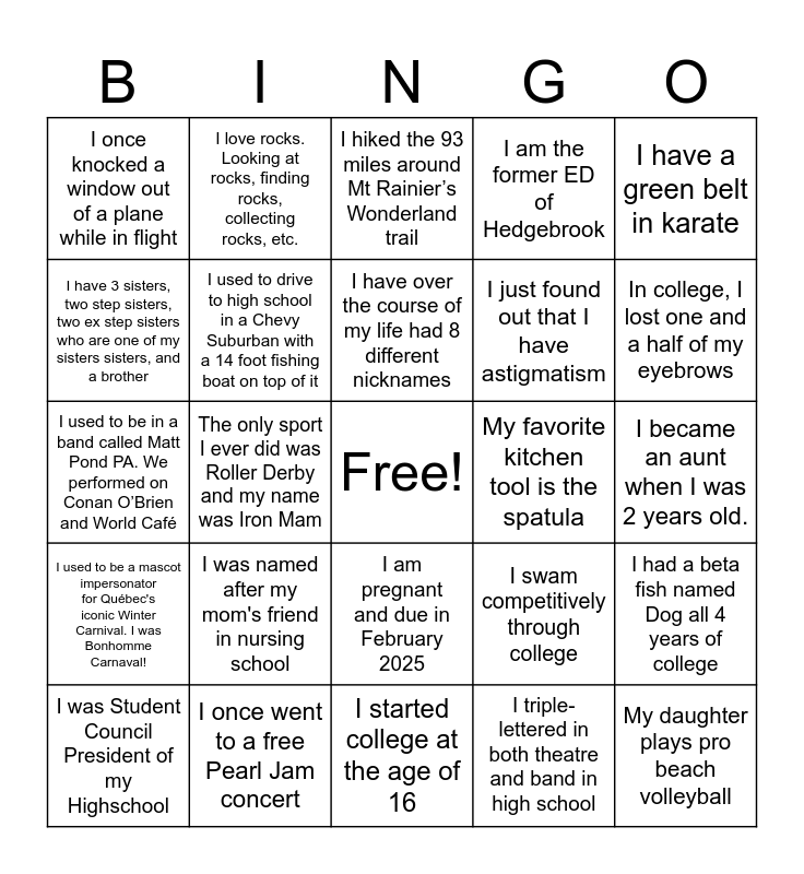 This bingo card has a free space and 24 words: I was named after my mom's friend in nursing school, I once went to a free Pearl Jam concert, I have over the course of my life had 8 different nicknames, I was Student Council President of my Highschool, I have a green belt in karate, I once knocked a window out of a plane while in flight, I have 3 sisters, two step sisters, two ex step sisters who are one of my sisters sisters, and a brother, I love rocks. Looking at rocks, finding rocks, collecting rocks, etc., My favorite kitchen tool is the spatula, I am pregnant and due in February 2025, I just found out that I have astigmatism, I used to be in a band called Matt Pond PA. We performed on Conan O’Brien and World Café, I swam competitively through college, I had a beta fish named Dog all 4 years of college, I used to drive to high school in a Chevy Suburban with a 14 foot fishing boat on top of it, I triple-lettered in both theatre and band in high school, I became an aunt when I was 2 years old., I hiked the 93 miles around Mt Rainier’s Wonderland trail, In college, I lost one and a half of my eyebrows, The only sport I ever did was Roller Derby and my name was Iron Mam, My daughter plays pro beach volleyball, I used to be a mascot impersonator for Québec's iconic Winter Carnival. I was Bonhomme Carnaval!, I am the former ED of Hedgebrook and I started college at the age of 16.