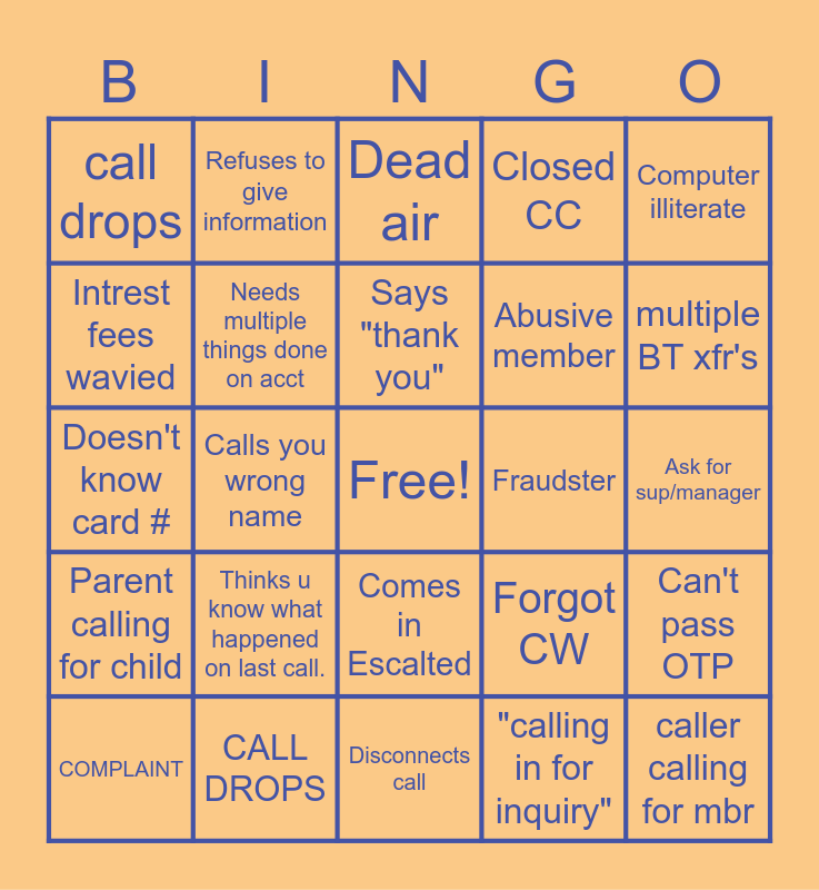 This bingo card has a free space and 24 words: Thinks u know what happened on last call., CALL DROPS, Says "thank you", COMPLAINT, Computer illiterate, call drops, Intrest fees wavied, Refuses to give information, Fraudster, Comes in Escalted, Abusive member, Doesn't know card #, Forgot CW, Can't pass OTP, Needs multiple things done on acct, "calling in for inquiry", Ask for sup/manager, Dead air, multiple BT xfr's, Calls you wrong name, caller calling for mbr, Parent calling for child, Closed CC and Disconnects call.