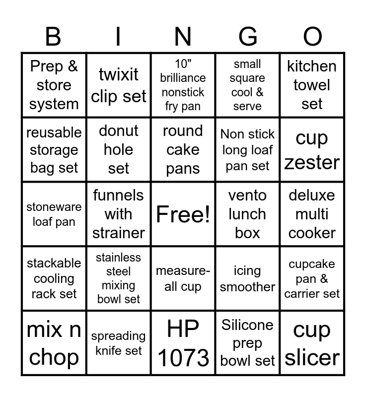 This bingo card has a free space and 25 words: stainless steel mixing bowl set, HP 1073, round cake pans, mix n chop, kitchen towel set, Prep & store system, reusable storage bag set, twixit clip set, vento lunch box, measure-all cup, Non stick long loaf pan set, stoneware loaf pan, icing smoother, cupcake pan & carrier set, donut hole set, basil infused olive oil, deluxe multi cooker, 10" brilliance nonstick fry pan, cup zester, funnels with strainer, cup slicer, spreading knife set, stackable cooling rack set, small square cool & serve and Silicone prep bowl set.