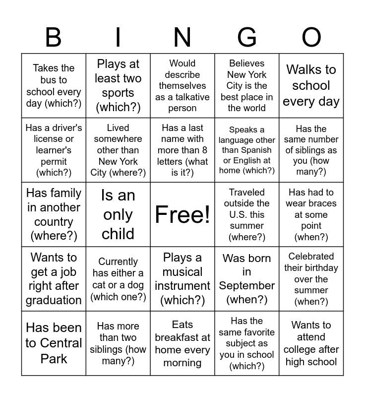 This bingo card has a free space and 24 words: Currently has either a cat or a dog (which one?), Has more than two siblings (how many?), Has a last name with more than 8 letters (what is it?), Has been to Central Park, Walks to school every day, Takes the bus to school every day (which?), Has a driver's license or learner's permit (which?), Plays at least two sports (which?), Traveled outside the U.S. this summer (where?), Plays a musical instrument (which?), Speaks a language other than Spanish or English at home (which?), Has family in another country (where?), Was born in September (when?), Celebrated their birthday over the summer (when?), Lived somewhere other than New York City (where?), Has the same favorite subject as you in school (which?), Has had to wear braces at some point (when?), Would describe themselves as a talkative person, Has the same number of siblings as you (how many?), Is an only child, Wants to attend college after high school, Wants to get a job right after graduation, Believes New York City is the best place in the world and Eats breakfast at home every morning.