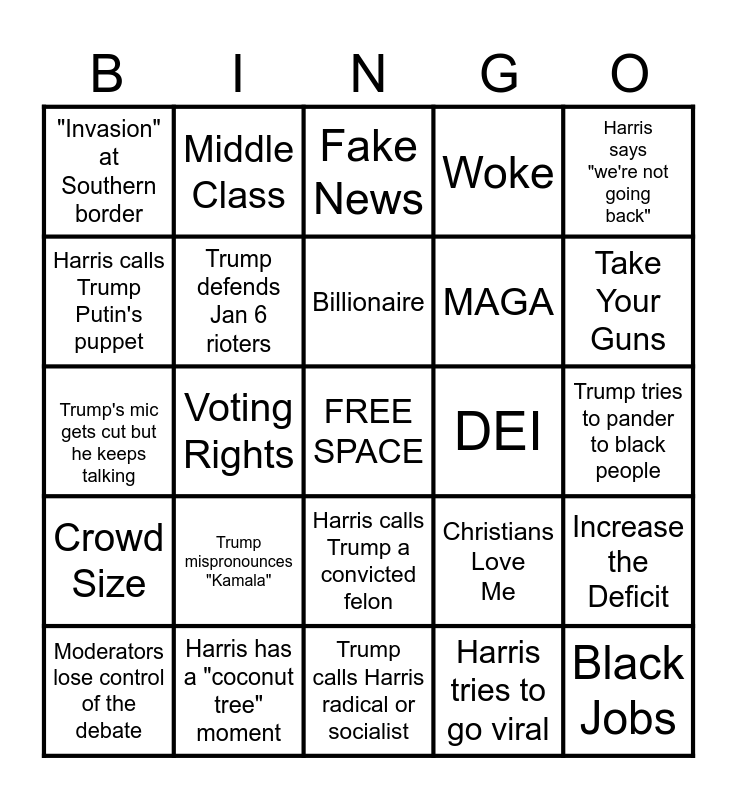 This bingo card has a free space and 29 words: Moderators lose control of the debate, "Mr. President, I'm speaking", Voting Rights, Harris attacks Trump for Roe v. Wade Guns, "Invasion" at Southern border, Fake News, Trump defends Jan 6 rioters, Trump mispronounces "Kamala", DEI, Harris has a "coconut tree" moment, Trump tries to pander to black people, Black Jobs, Trump calls Harris radical or socialist, Harris tries to go viral, Take Your Guns, Trump says 2020 was rigged, Harris calls Trump a convicted felon, Crowd Size, Harris says "we're not going back", Trump's mic gets cut but he keeps talking, Christians Love Me, Trump says "bigly" or tremendous", MAGA, Harris calls Trump Putin's puppet, Woke, Middle Class, Increase the Deficit, Billionaire and Black Jobs.