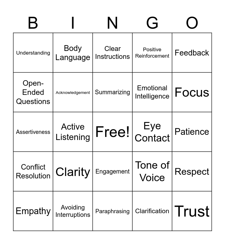 This bingo card has a free space and 25 words: Clarity, Paraphrasing, Summarizing, Empathy, Feedback, Understanding, Open-Ended Questions, Body Language, Eye Contact, Engagement, Emotional Intelligence, Assertiveness, Tone of Voice, Respect, Acknowledgement, Nonverbal Cues, Patience, Clear Instructions, Focus, Active Listening, Trust, Avoiding Interruptions, Conflict Resolution, Positive Reinforcement and Clarification.