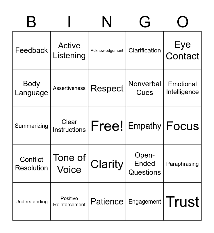 This bingo card has a free space and 25 words: Tone of Voice, Patience, Respect, Understanding, Eye Contact, Feedback, Body Language, Active Listening, Empathy, Clarity, Nonverbal Cues, Summarizing, Open-Ended Questions, Paraphrasing, Assertiveness, Avoiding Interruptions, Focus, Acknowledgement, Emotional Intelligence, Clear Instructions, Trust, Positive Reinforcement, Conflict Resolution, Clarification and Engagement.