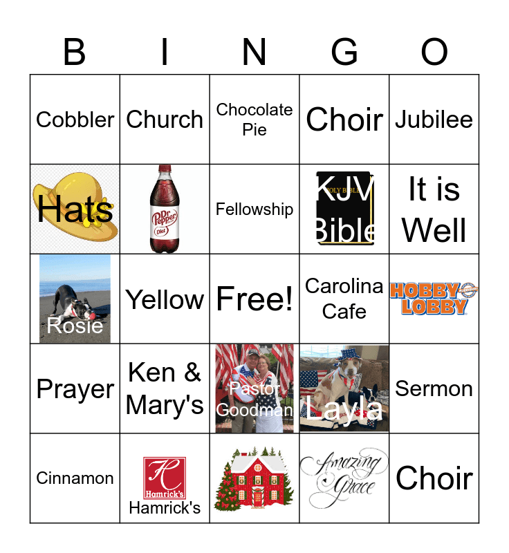 This bingo card has 13 images, a free space and 25 words: Cinnamon, Roses, Yellow, Milky Way, Cobbler, Chocolate Pie, Ken & Mary's, Carolina Cafe, Hamrick's, Choir, It is Well, Henry & Ruby, Pastor Goodman, Prayer, Jubilee, Rosie, Layla, Ladies Ministry, KJV Bible, Hats, Choir, Church, Sermon, Fellowship and Potluck.