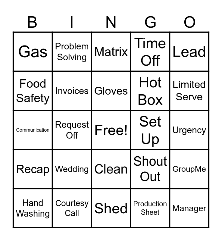 This bingo card has a free space and 24 words: Wedding, Courtesy Call, Gloves, Hand Washing, Lead, Gas, Food Safety, Problem Solving, Set Up, Clean, Hot Box, Communication, Shout Out, GroupMe, Invoices, Production Sheet, Urgency, Matrix, Limited Serve, Request Off, Manager, Recap, Time Off and Shed.